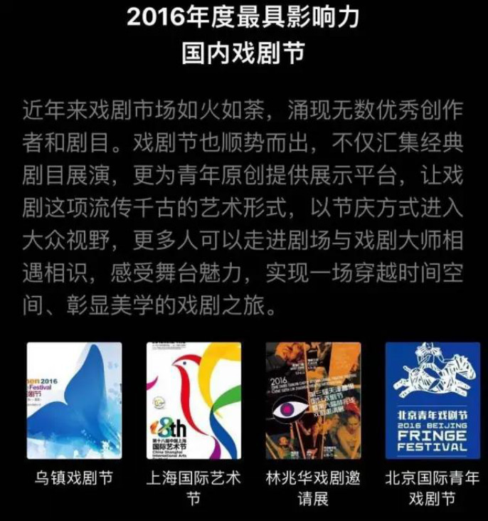 2016年(nian)年(nian)末豆瓣評選年(nian)度最具(ju)影響力(li)的(de)國(guo)內(nei)戲劇節(jie),烏鎮戲劇節(jie)榜上有(yǒu)名(míng)。